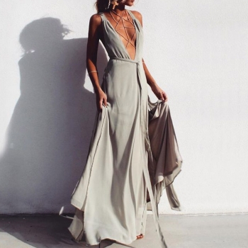 Sexy Deep V-neck Solid Color Sleeveless Slit Hemline Slim Fit Dress