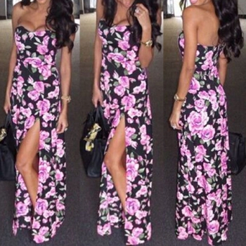 Sexy Floral Printed Strapless Backless Slit Hem Maxi Dress