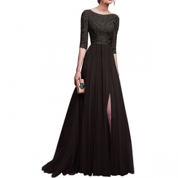 Sexy Lace Spliced Half Sleeve High Waist Slit Hem Evening Dress (Size falls small)