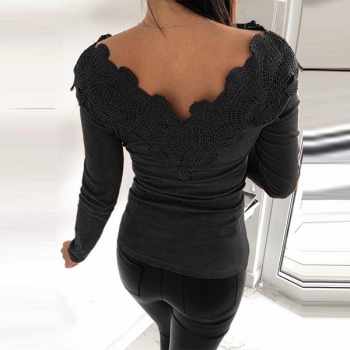 Sexy Lace Spliced Long Sleeve Solid Color Slim Fit T-shirt