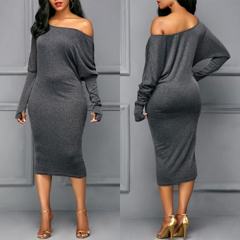 Sexy Oblique Shoulder Long Sleeve Solid Color Slim Fit Dress