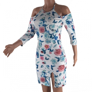 Sexy Off-shoulder 3/4 Sleeve Slim Fit Printed Halter Dress