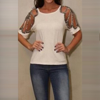 Sexy Off-shoulder Beaded Short Sleeve Round Neck T-shirt