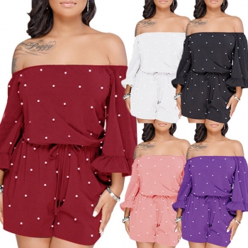 Sexy Off-shoulder Boat Neck 3/4 Sleeve High Waist Dots Printed Romper