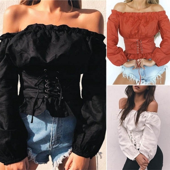 Sexy Off-shoulder Boat Neck Long Sleeve Lace-up Solid Color Top