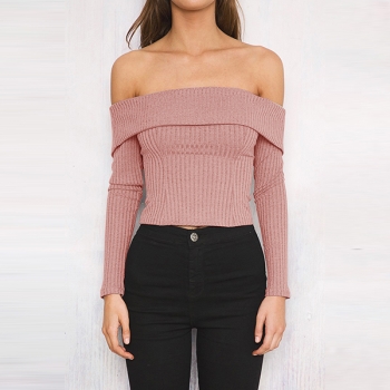Sexy Off-shoulder Boat Neck Long Sleeve Solid Color Knit Top