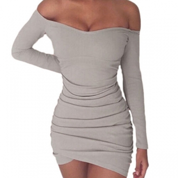 Sexy Off-shoulder Boat Neck Long Sleeve Solid Color Mini Tight Dress