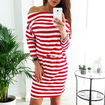 Sexy Off-shoulder Boat Neck Long Sleeve Striped Dress