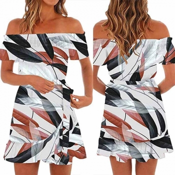 Sexy Off-shoulder Boat Neck Ruffle Hem Printed Dress