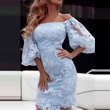 Sexy Off-shoulder Boat Neck Trumpet Sleeve Embroidered Spliced Party Dress