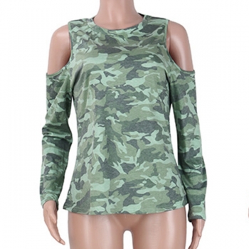 Sexy Off-shoulder Long Sleeve Round Neck Camouflage Printed T-shirt