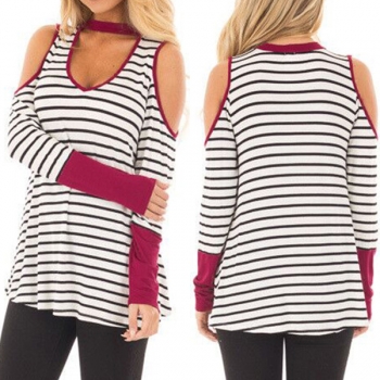Sexy Off-shoulder Long Sleeve V-neck Striped T-shirt