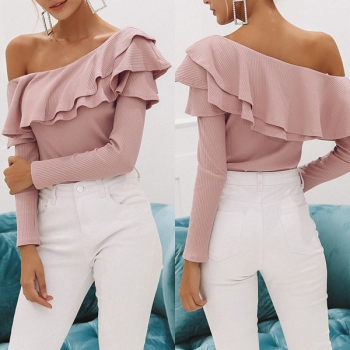 Sexy Off-shoulder Ruffle Baot Neck Long Sleeve Solid Color Top