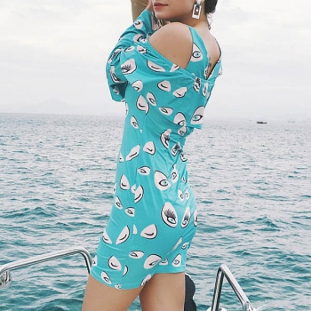 Sexy Off-shoulder Trumpet Sleeve V-neck Slim Fit Printed Dress