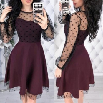 Sexy See-through Gauze Spliced Long Sleeve Round Neck Dress