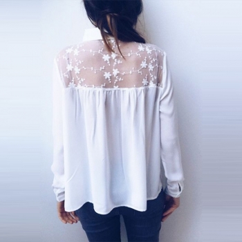 Sexy See-through Lace Spliced Long Sleeve POLO Collar Shirt