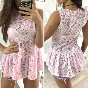 Sexy Sleeveless Round Neck Ruffle Hem Hollow Out Lace Top
