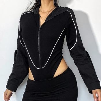 Sexy Slit Long Sleeve V-neck Hooded Solid Color Bodysuit