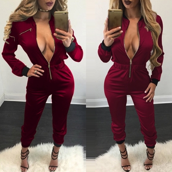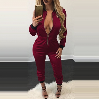 Sexy Solid Color Front Zipper V-neck Long Sleeve Gathered Waist Jumpsuit