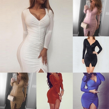 Sexy Solid Color V-neck Long Sleeve Crinkle Front Slit Bodycon Dress