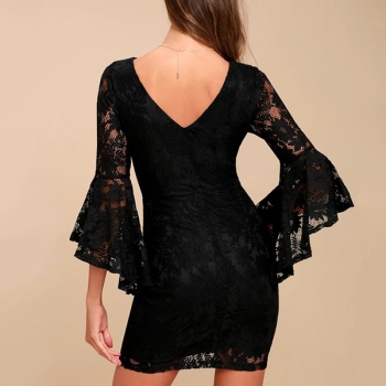 Sexy V-neck Embroidered Lace Spliced Trumpets Sleeve Slim Fit Dress