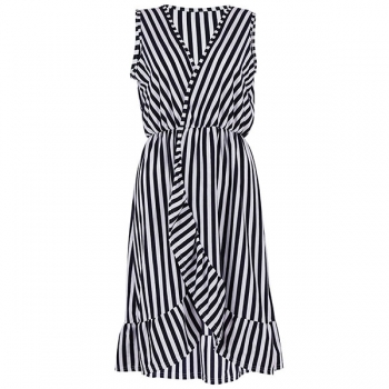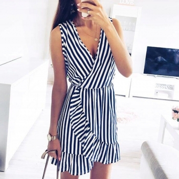 Sexy V-neck Irregular Ruffle Hem Sleeveless Striped Dress