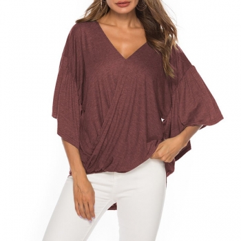 Sexy V-neck Lotus Sleeve Solid Color T-shirt