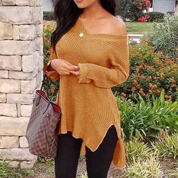 Sexy V-neck Slit Hem Long Sleeve Solid Color Top