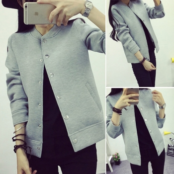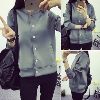 Stylish Solid Color Stand Collar Long Sleeve Single-breasted Women's Baseball Coat
