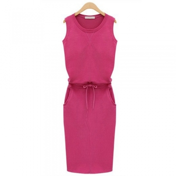 Fashion Sleeveless Round Neck Gathered Waist Solid Color Dress