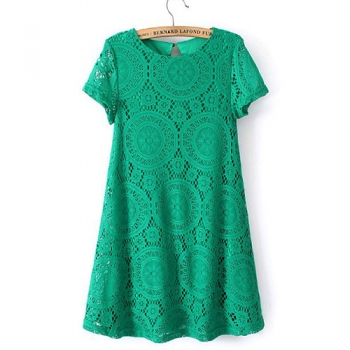 Loose Fitting Solid Color Floral Crochet Fishnet Cutout Short Sleeves Lace Shift Dress