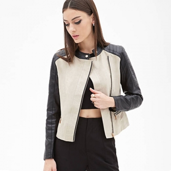 Fashion Contrast Color Oblique Zipper Slim Fit PU Leather Jacket