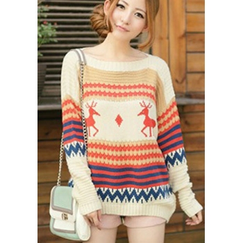 Retro Sweet Christmas Deer Wavy Stripe Warm Women's Pullover Knit Sweater