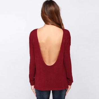 Sexy Backless Solid Color Long Sleeve Loose T-shirt