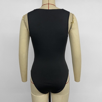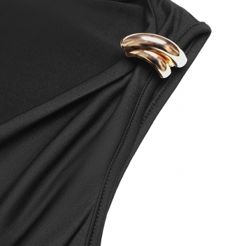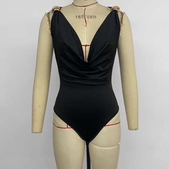 Chic Black Draped Neck Bodysuit with Gold Metal Ring Straps