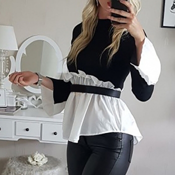 Chic Style Trumpet Sleeve Mock Neck Chiffon Spliced Hem Top