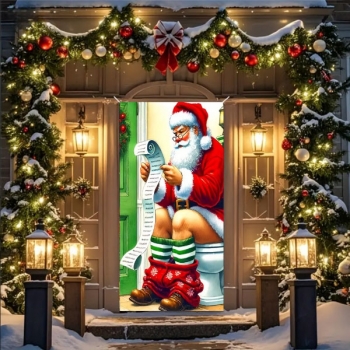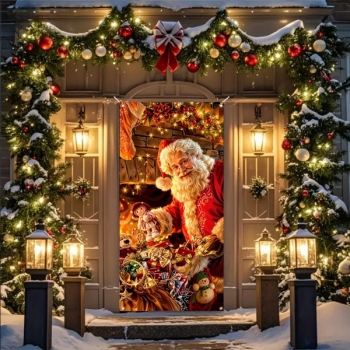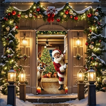 Christmas Door Banner Decorations, Santa Claus Snowman Door Cover for Front Door, Indoor Outdoor Holiday Party Porch Wall Decor, Reusable Polyester Fabric Xmas Photo Booth Backdrop