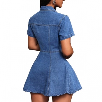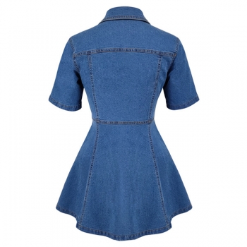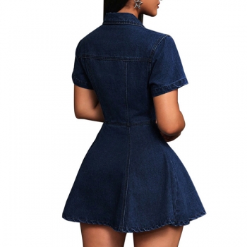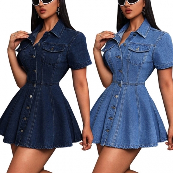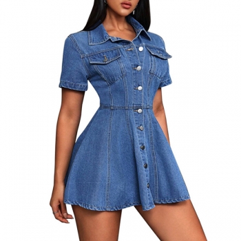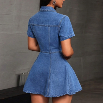 Casual Denim Dress with Stand Collar, Short Sleeve, High-rise and Front Button
