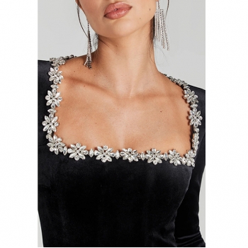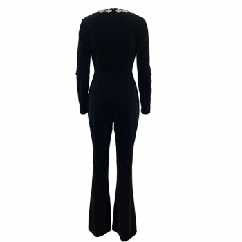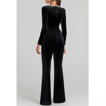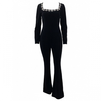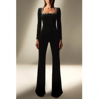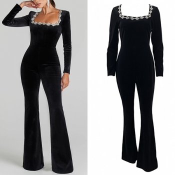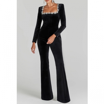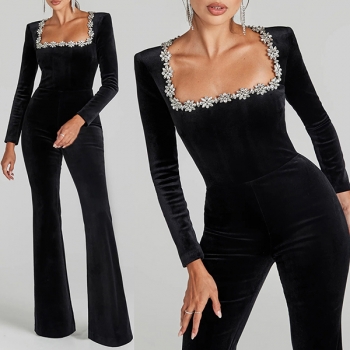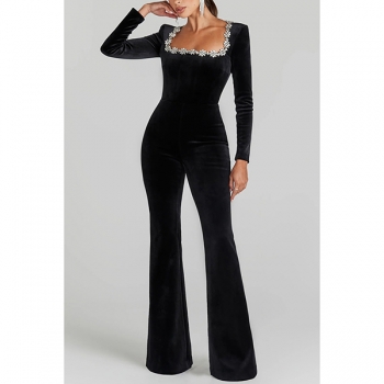 Elegant Floral Rhinestone Square Neck Long Sleeve Straight-cut Jumpsuit