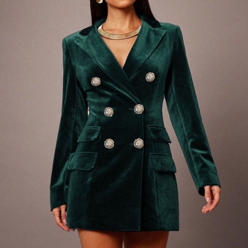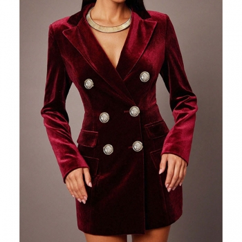 Elegant Lapel V-neck Long Sleeve Double-breasted Velvet Suit Dress