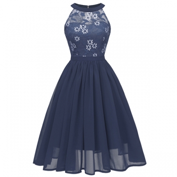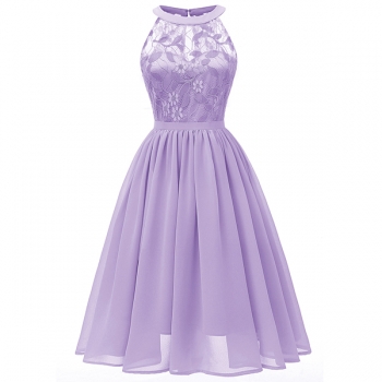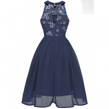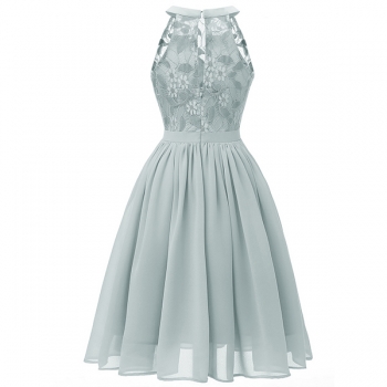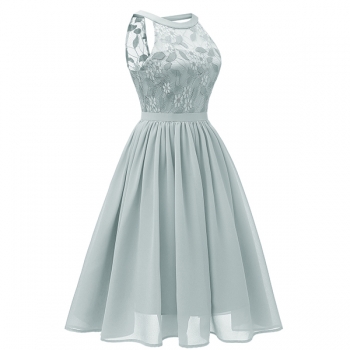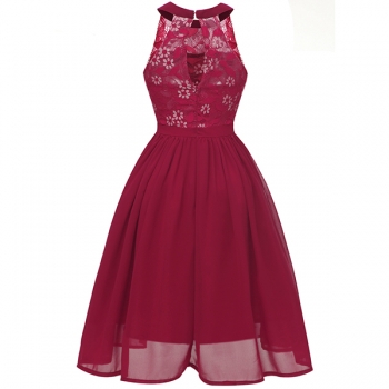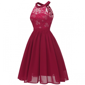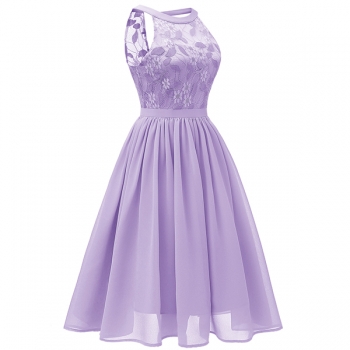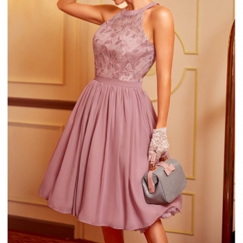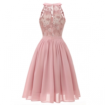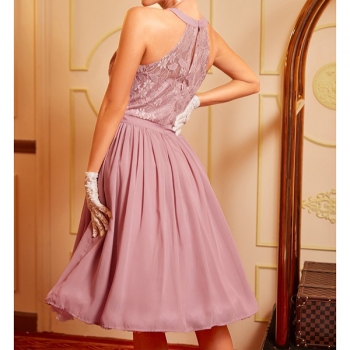 Elegant Solid Color Sleelveless Lace Spliced Pleated Mini Dress