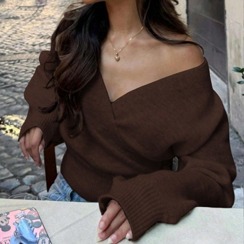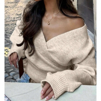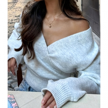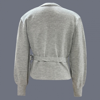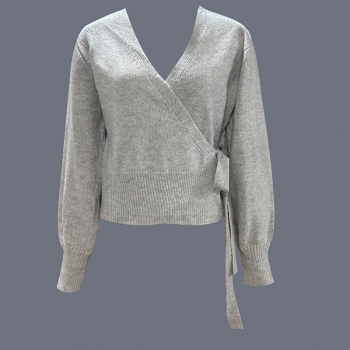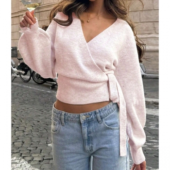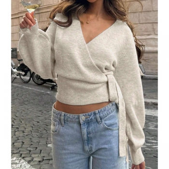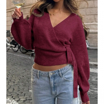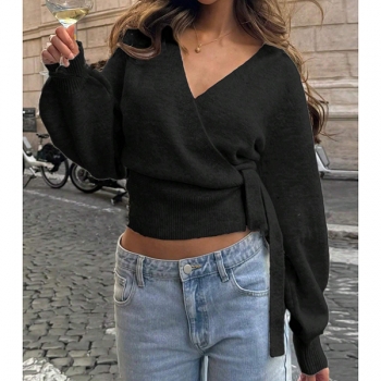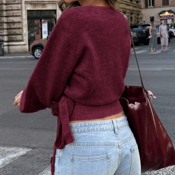 Elegant Surplice Wrap Front Knitted Jumper - Bishop Sleeve Side Knot Crop Sweater
