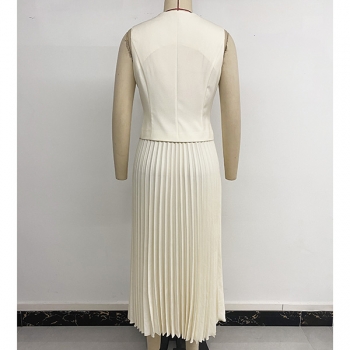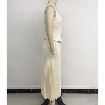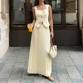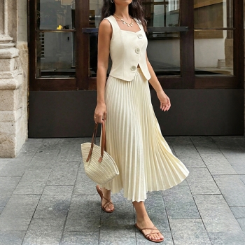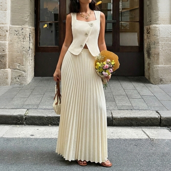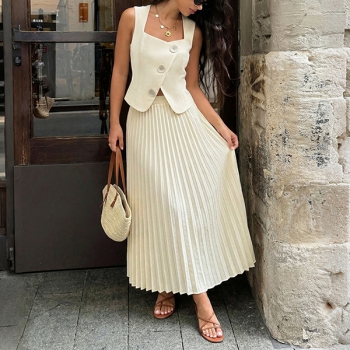 Elegant Two-Piece Set: Asymmetric Button Vest Top & Pleated Maxi Skirt
