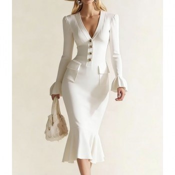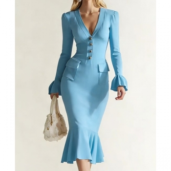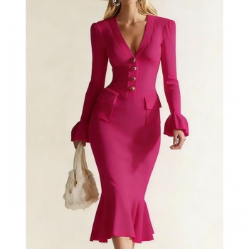 Elegant V-neck Trumpet Long Sleeve Front Button Patch Pockets Fishtail Hemline Bodycon Dress
