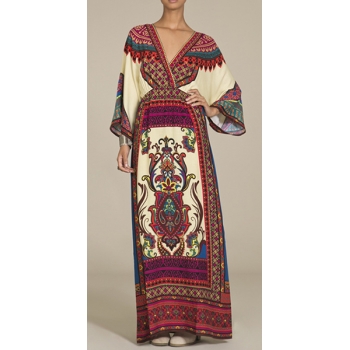Ethnic Style Trumpet Sleeve V-neck High Waist Printed Maxi Dress