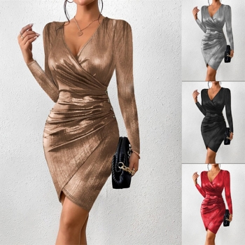 Fashion Bright Color V-neck Long Sleeve Irregular Hemline Bodycon Dress
