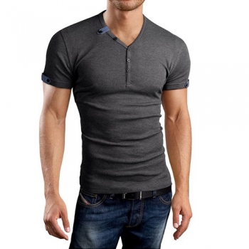 Fashion Button-Up V-Neck Short Sleeves Solid Color T-Shirt