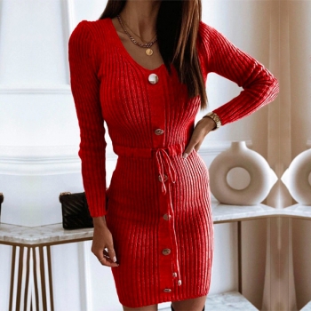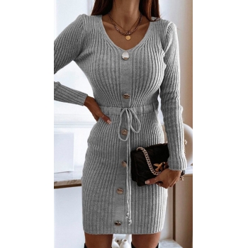 Fashion Button V-neck Long Sleeve Drawstring Waist Ribbed Dress