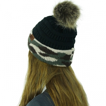 Fashion Camouflage Printed Hairball Spliced Knit Beanies