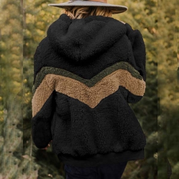 Fashion Contrast Color Long Sleeve Hooded Plush Coat